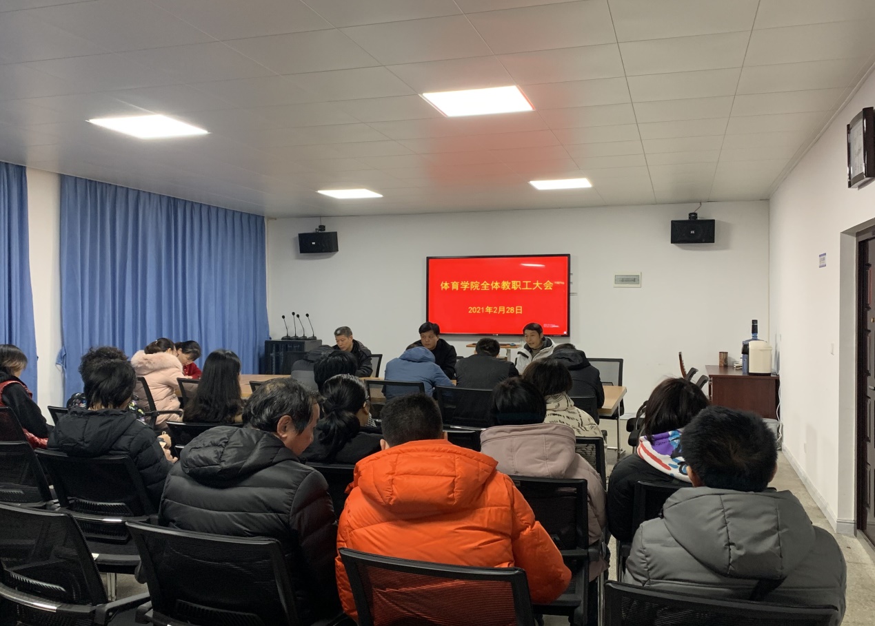 谭志刚对开学工作进行了安排部署:一要提高政治站位,切实做好常态化防御防控与开学准备工作;二要认真做好常规教学工作,切实抓好体育教学质量,上好开学第一课。三要做好招生工作,切实抓好2021年高水平运动员测试工作;四要认真做好工会工作,切实抓好“三八”妇女节竞赛等相关工作;五要认真做好赛事筹备工作,切实抓好2021年度省级赛事在校举办的相关工作;六要认真做好日常管理工作,不断提升管理质量和服务水平。